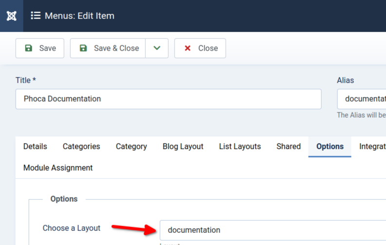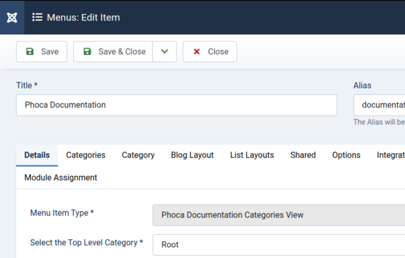 Now click Save & Close button to save the menu link. You should see the Joomla Categories view in Phoca Documentation style in frontend now.