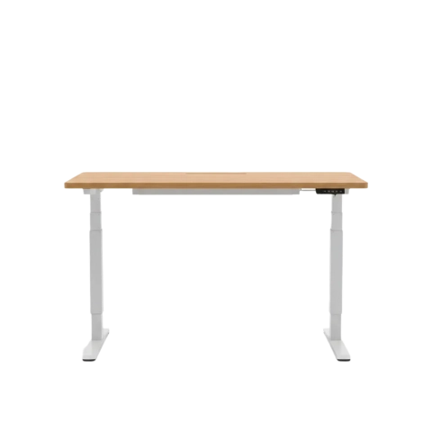 Motorized height-adjustable desk with bamboo top.