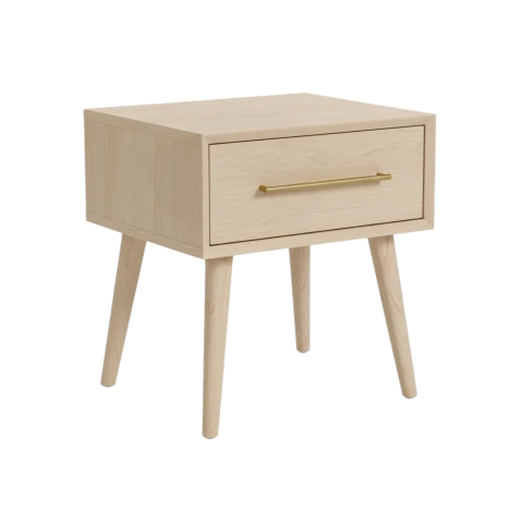 Single drawer nightstand with modern brass handle.