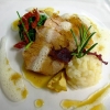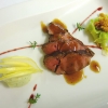 Saddle of venison on celery purée with glazed cherries